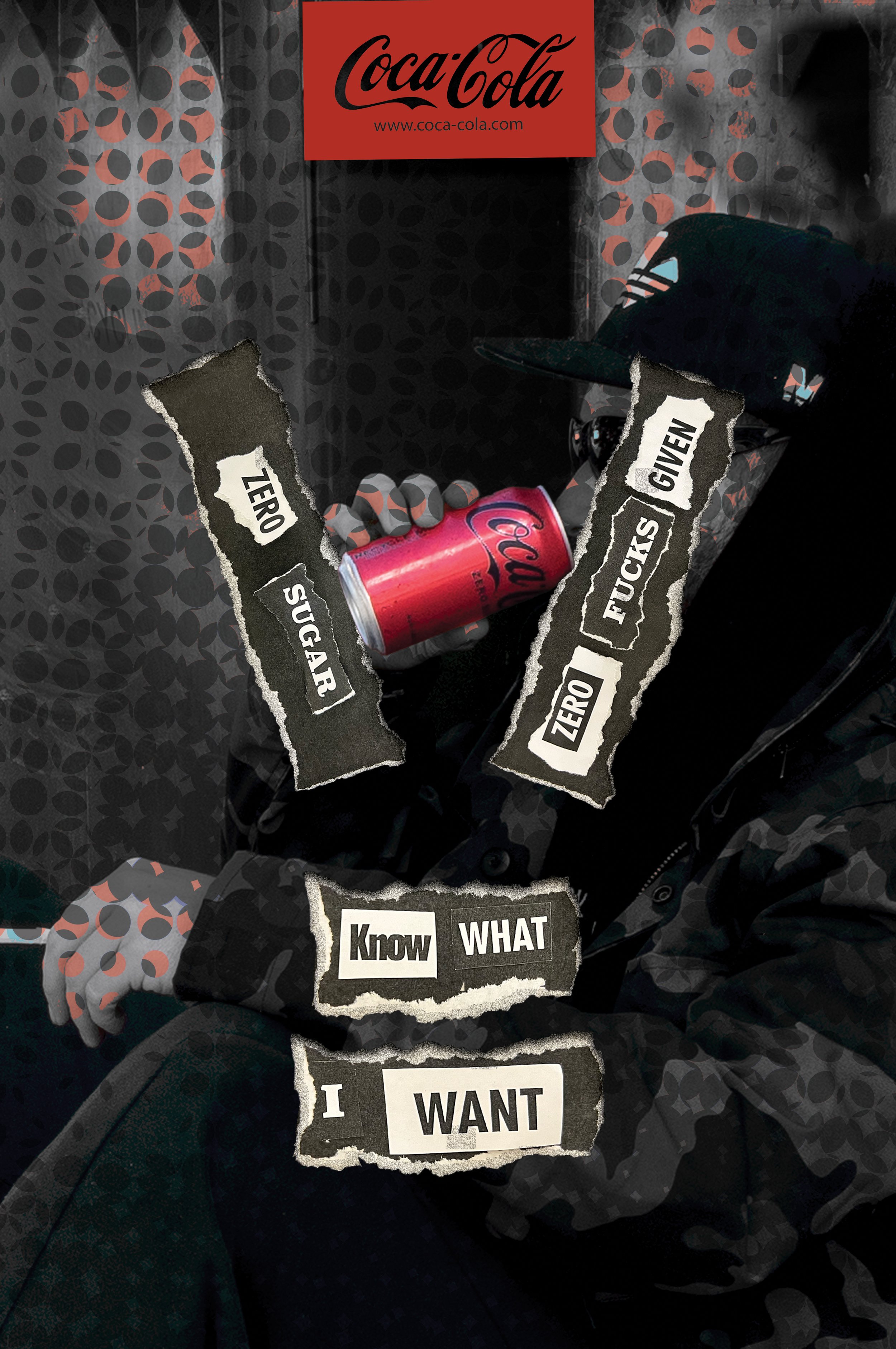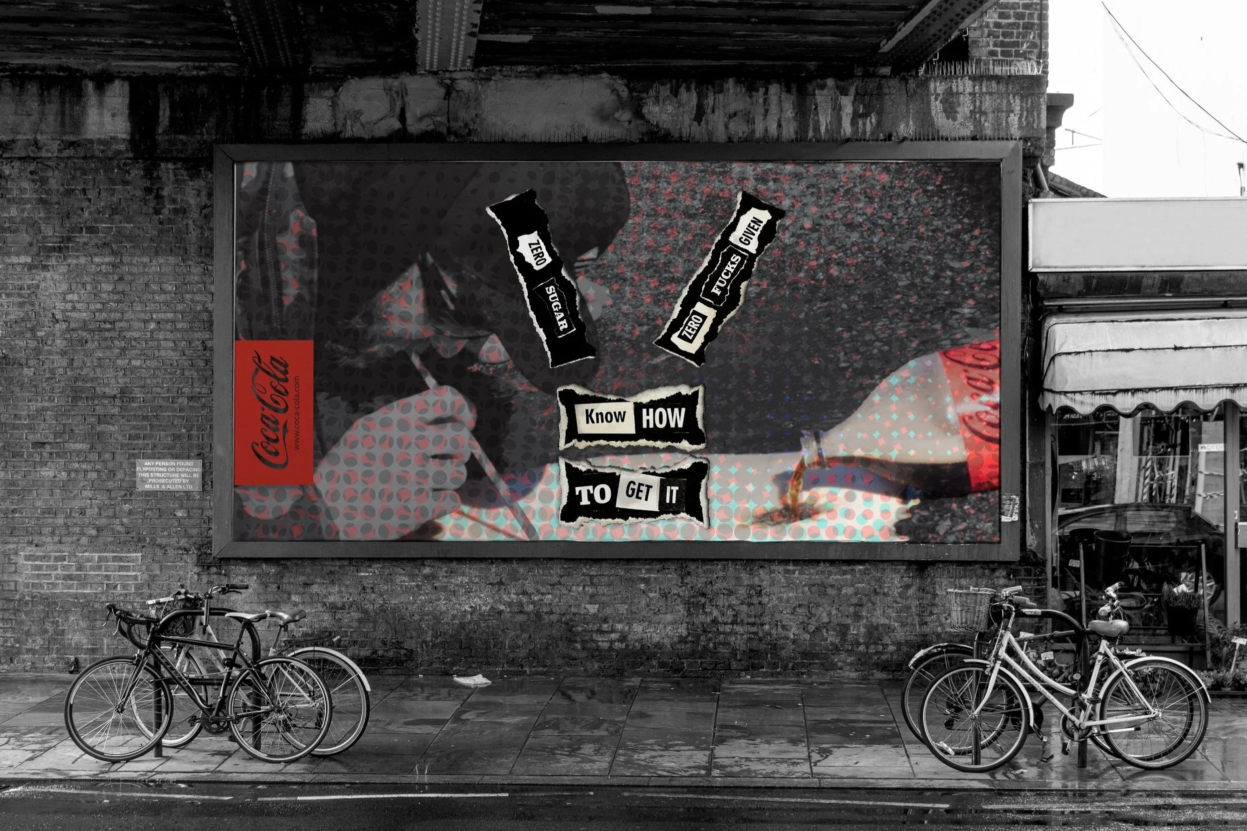 This concept hijacks Coca-Cola’s red-and-black iconography and collides it with torn typography, halftone grit, and zine-style rebellion.