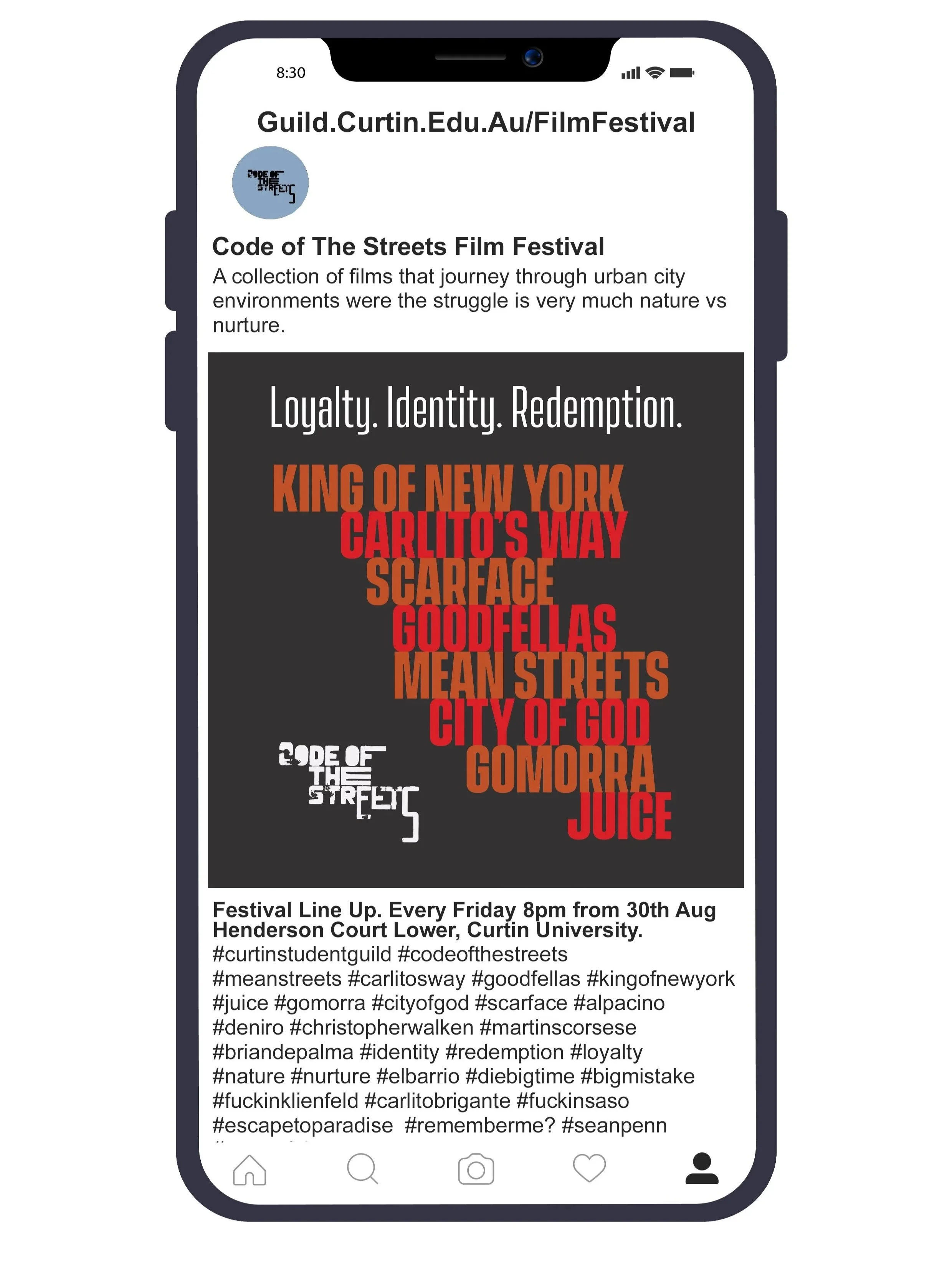 A FILM FESTIVAL BUILT ON GRIT, LOYALTY, AND THE UNWRITTEN RULES THAT SHAPE LIFE ON THE MARGINS. CODE OF THE STREETS CELEBRATES CINEMA’S MOST ICONIC URBAN CRIME STORIES, FROM CARLITO’S WAY TO CITY OF GOD, WITH A VISUAL IDENTITY THAT MIRRORS THE TENSION AND SWAGGER OF THE GENRE.