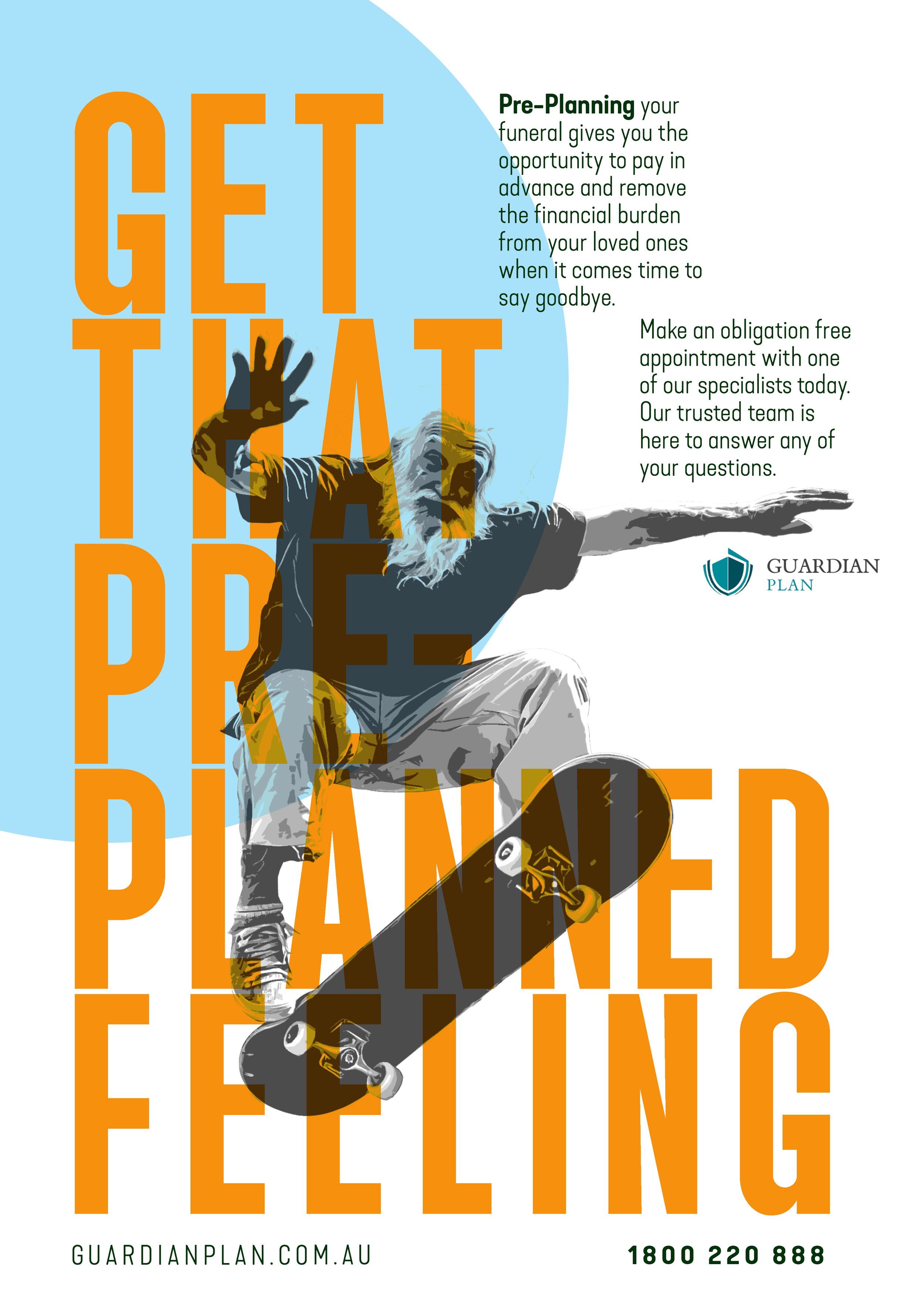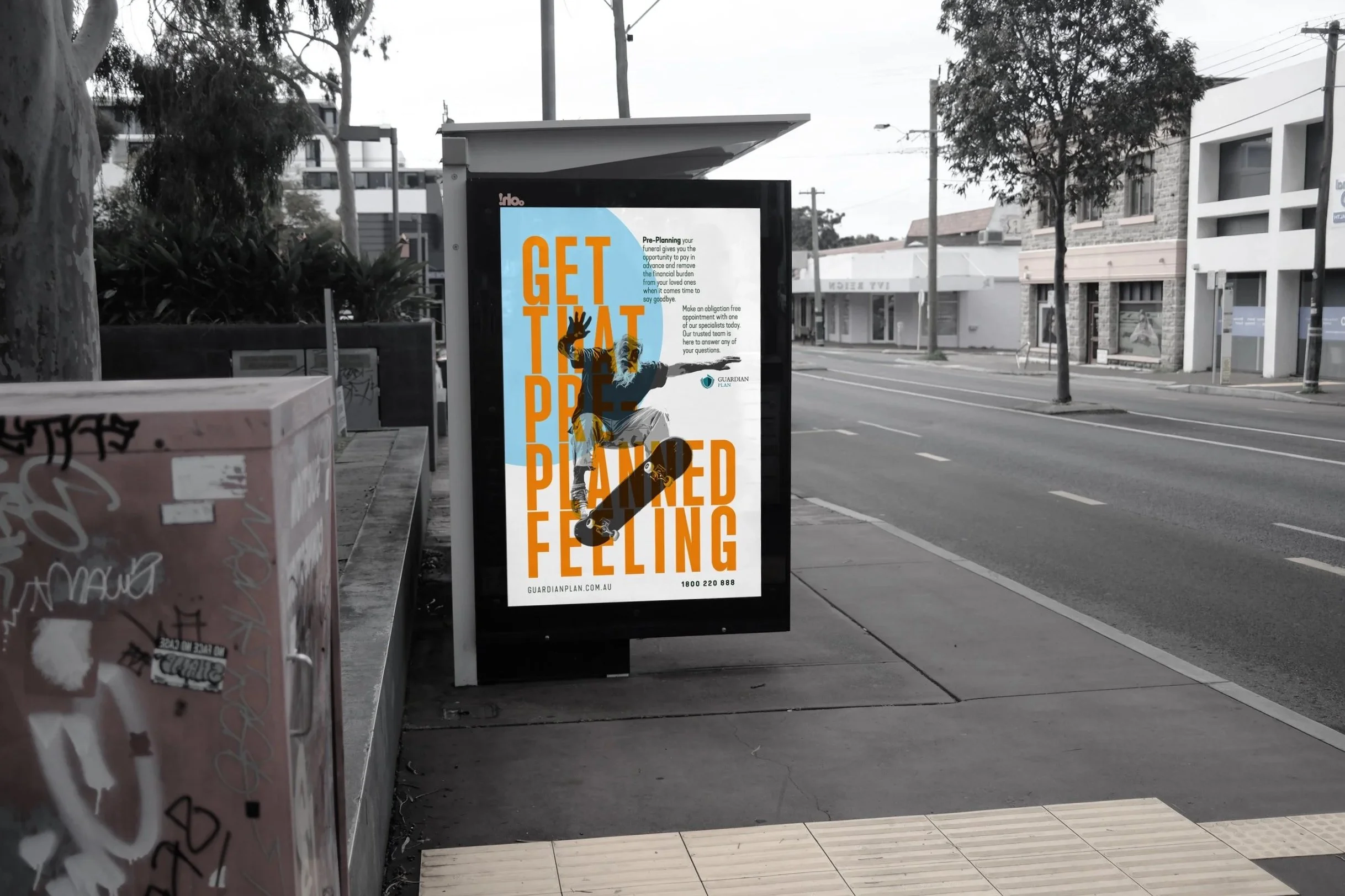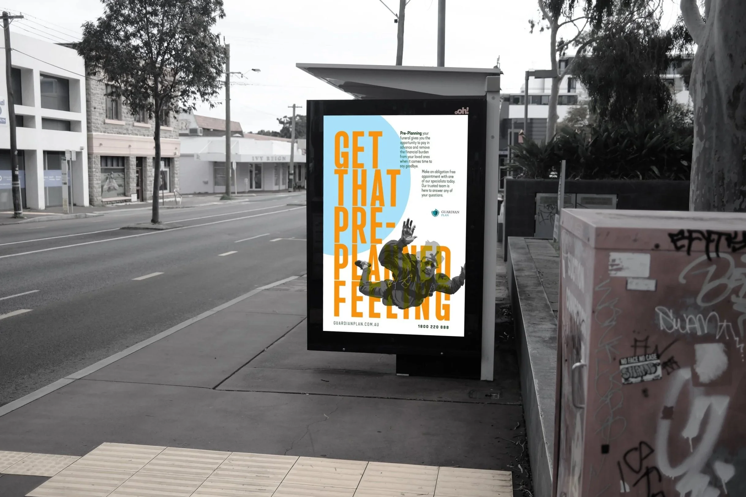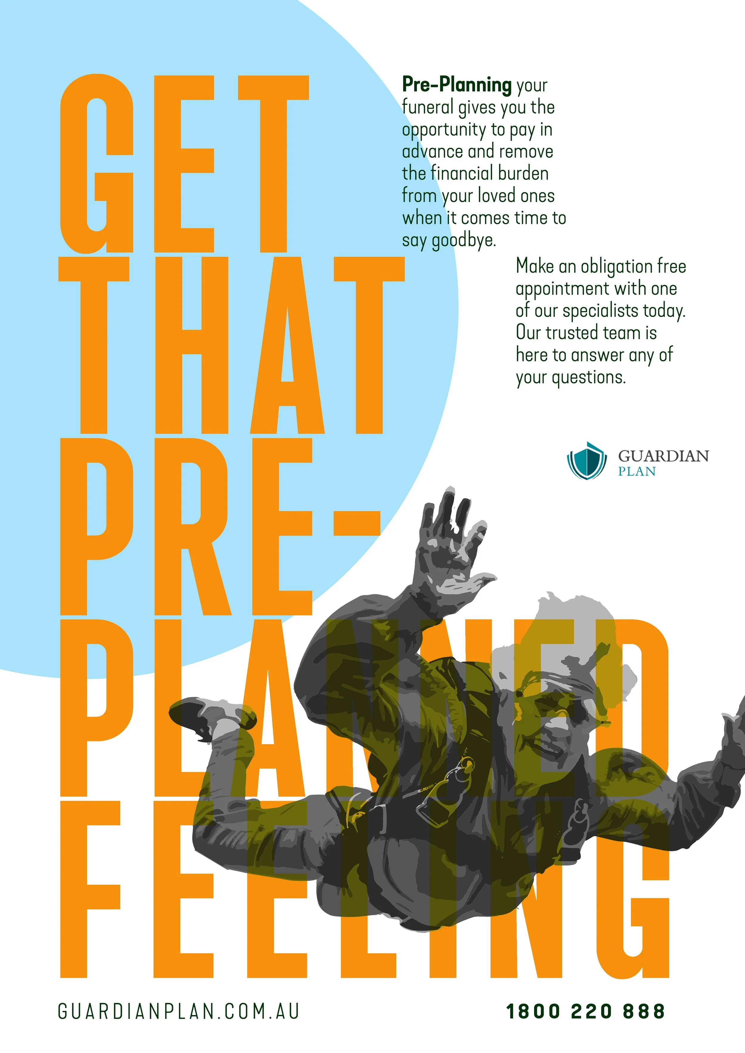 GUARDIAN PLAN CHALLENGES THE VISUAL LANGUAGE OF FUNERAL ADVERTISING BY REFUSING THE EXPECTED CUES OF SOFTNESS, SILENCE, AND SENTIMENTALITY.