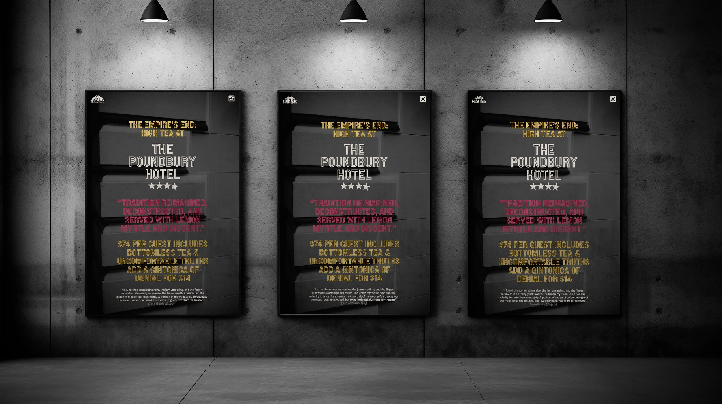 A FICTIONAL HOSPITALITY BRAND BUILT AS SATIRE AND SOCIAL MIRROR. THE POUNDBURY HOTEL TAKES AIM AT INHERITED GRANDEUR AND THE STRANGE NOSTALGIA OF COLONIAL AESTHETICS,THE EMPIRE REPACKAGED AS BOUTIQUE LUXURY.